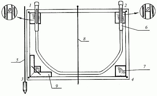 Аналогичную операцию проводим на другой стороне стены. Точку для верх него гвоздя 3 определяем с помощью гибкого уровня, использующего закон сообщающихся сосудов (рис. 39). Нулевое деление (уровень воды) одной из визирных трубок уровня совмещаем с гвоздем 1, тогда нулевая отметка (уровень воды) другой визирной трубки покажет место для гвоздя 3. Эту операцию удобнее производить вдвоем. С помощью отвеса, привязанного на гвоздь 3, находим точку для установки гвоздя 4 (аналогично гвоздю 2). Между гвоздями 3 и 4 также натянем причальный шнур.