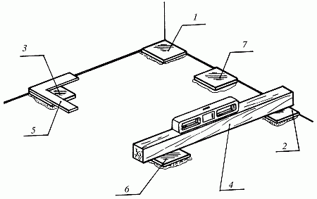 Рис. 40. Разметка горизонтальной поверхности и установка маяков: 1–3 – угловые маячные плитки; 4 – деревянная рейка; 5 – угольник; 6–7 – промежуточные маячные плитки