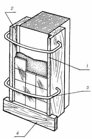 Рис. 41. Облицовка четырехгранных колонн: 1 – маячные рейки; 2 – четверть; 3 – дуговые рейкодержатели; 4 – опорная рейка