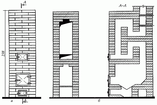 1-й ряд – по углам кладут трехчетвертные кирпичи, переднюю стенку выкладывают тычками. Стесывают по верхним граням два средних кирпича, делая откос по направлению ко дну зольника (разрез А—А). Пространство между задней стенкой зольника и наружной стенкой печи засыпают сухим песком до 3-го ряда включительно.