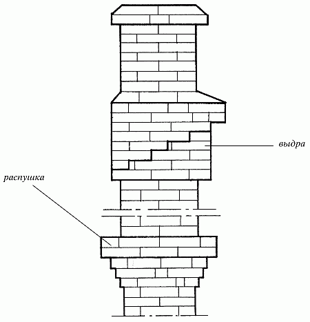 Выдру кладут на стояке с тщательной перевязкой швов. В рассматриваемом варианте кладка состоит из девяти рядов. Каждый ряд выступает за пределы стояка на четверть кирпича. Внутри выдры вставляют кирпичные пластинки такой толщины, чтобы они сохраняли без изменения размеры канала.