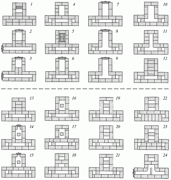 11–13-й – продолжение кладки жаровой камеры с выпусками для перекрытия топливника.