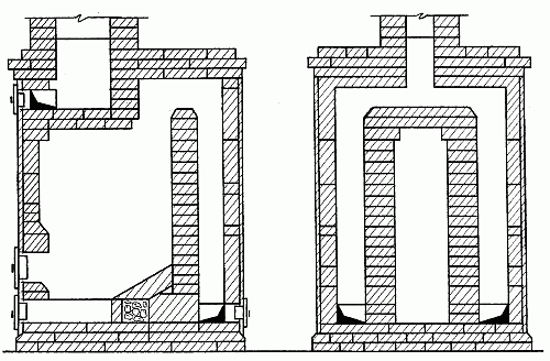 Конструкций печей, имеющих в плане круглую форму, не так уж много. Большинство из них снабжены снаружи футляром из листового металла. Как правило, футляр состоит из трех отдельных секций (царг), которые насаживаются друг на друга. Футляр делает стенки печи абсолютно газонепроницаемыми, они прогреваются быстро и равномерно.
