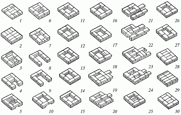 Завершив эту операцию, приступают к выполнению кирпичной кладки в соответствии с порядовкой, показанной на рис. 64.