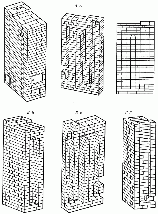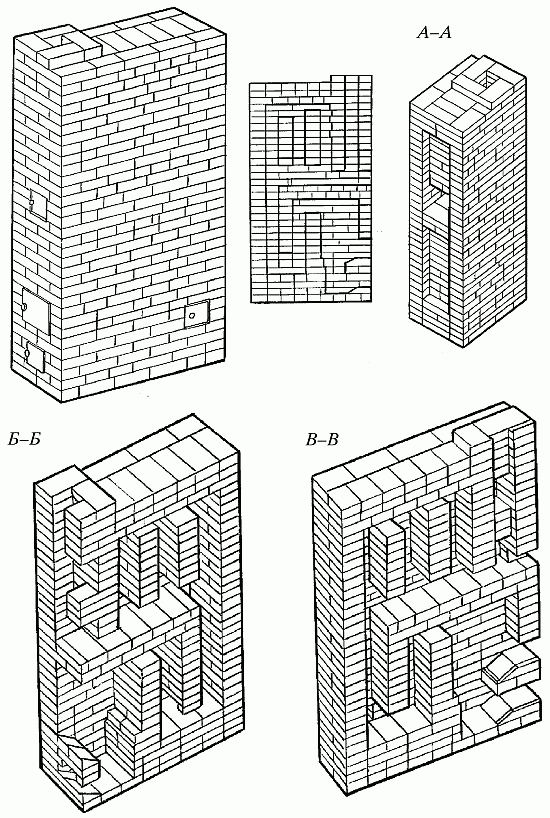 Рис. 66. Прямоугольная отопительная печь с тремя вертикальными каналами