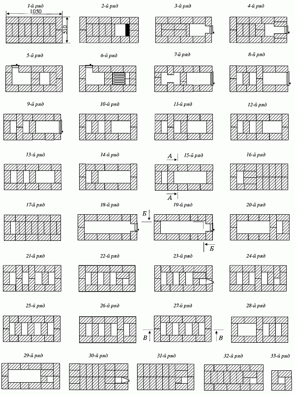 11–17-й ряды – кладка колодца прямоугольной формы с соблюдением перевязки швов между четными и нечетными рядами.