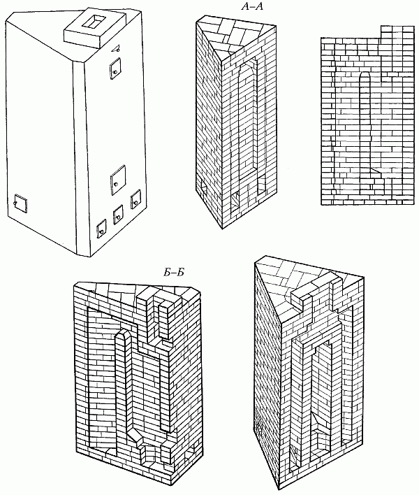 Так как для топки треугольной печи можно использовать любое твердое топливо, кладка ее топочной камеры выполняется из огнеупорного кирпича.