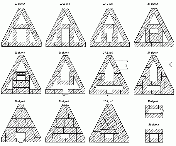 21–28-й ряды – формирование газоходов в соответствии с порядовкой. На 27-м ряду следует установить дымовую задвижку.