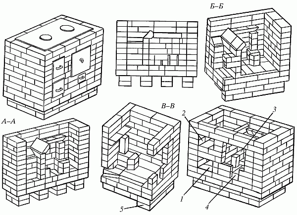 Рис. 76. Кухонная плита на шанцах: 1 – поддувальная дверка; 2 – топочная дверка; 3 – духовой шкаф; 4 – дверка чистки; 5 – шанцы