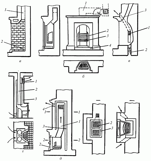 Рис. 80. Камины и каминопечи: а – камин: 1 – дымовая труба; 2 – под; б – камин с чугунной решеткой: 1 – дымовая труба; 2 – решетка; 3 – таган; 4 – под; в – камин с воздушным калорифером: 1 – коробка; 2, 3 – входной и выходной воздушные патрубки; г – камин с трубой: 1 – душник; 2 – дымовая труба; 3 – воздушный канал; д – печь-камин: 1 – подъемный газоход; 2 – топочная дверка; 3 – опускной газоход; 4 – душник