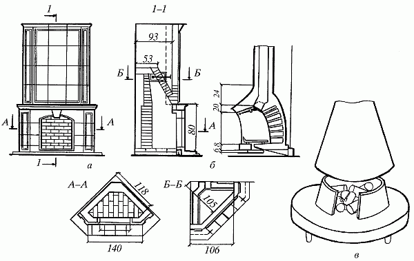 Рис. 81. Конструкции каминов: а – закрытый; б – полуоткрытый; в – открытый