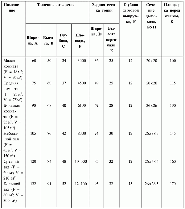 При выборе конструкции камина следует также правильно подобрать его размер в соответствии с площадью помещения (табл. 3и 4).