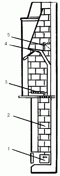 Рис. 82. Камин с чистым излучением (старогерманский): 1 – зольник; 2 – золовой канал; 3 – решетка топливника; 4 – заслонка; 5 – отверстие для чистки газохода