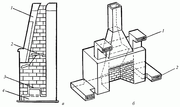 Рис. 83. Камины с подогревом воздуха: а – с калорифером: 1 – выход нагретого воздуха; 2 – дымовая заслонка; 3 – решетка; 4 – вход холодного воздуха; б – с каналом для нагрева приточного воздуха: 1 – выход нагретого воздуха; 2 – вход холодного воздуха