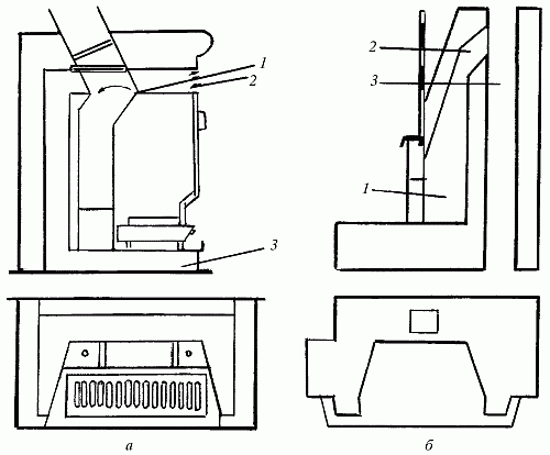 Рис. 84. Камины с боковым расположением дымового канала: а – угольный: 1 – перекидной клапан; 2 – выход нагретого воздуха; 3 – вход холодного воздуха; б – дровяной: 1 – камин; 2 – соединительный газоход; 3 – дымоход