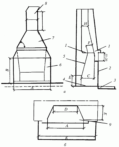Рис. 85. Камины с боковым расположением дымового канала:а – угольный: 1 – перекидной клапан; 2 – выход нагретого воздуха; 3 – вход холодного воздуха; 4 – днище очага; 5 – задняя стенка; 6 – боковая стенка; 7 – дымовая коробка; 8 – труба б – дровяной: 9 – топочное пространство