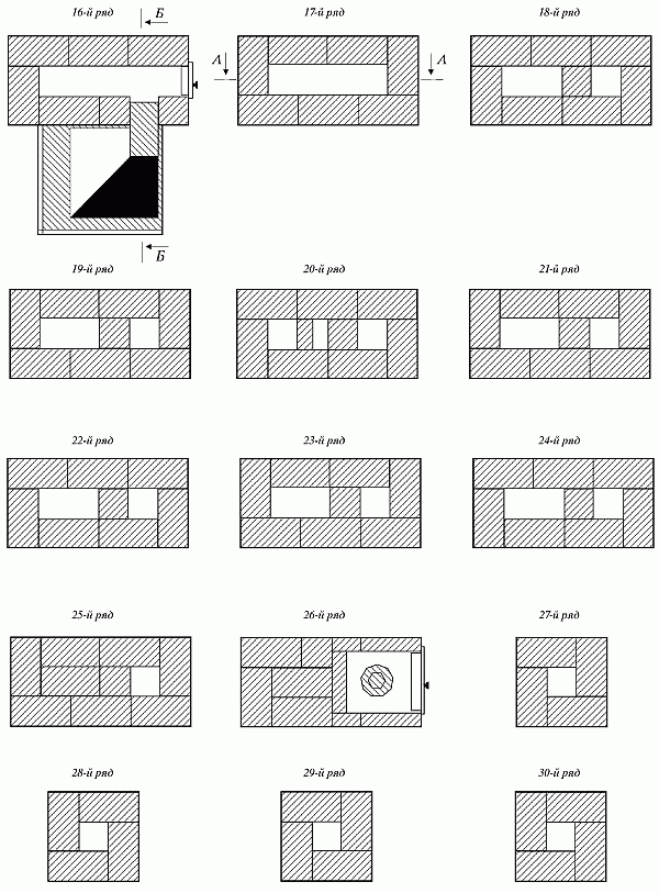 27-й ряд – окончание кладки перекрыши печи, начало формирования дымовой трубы.