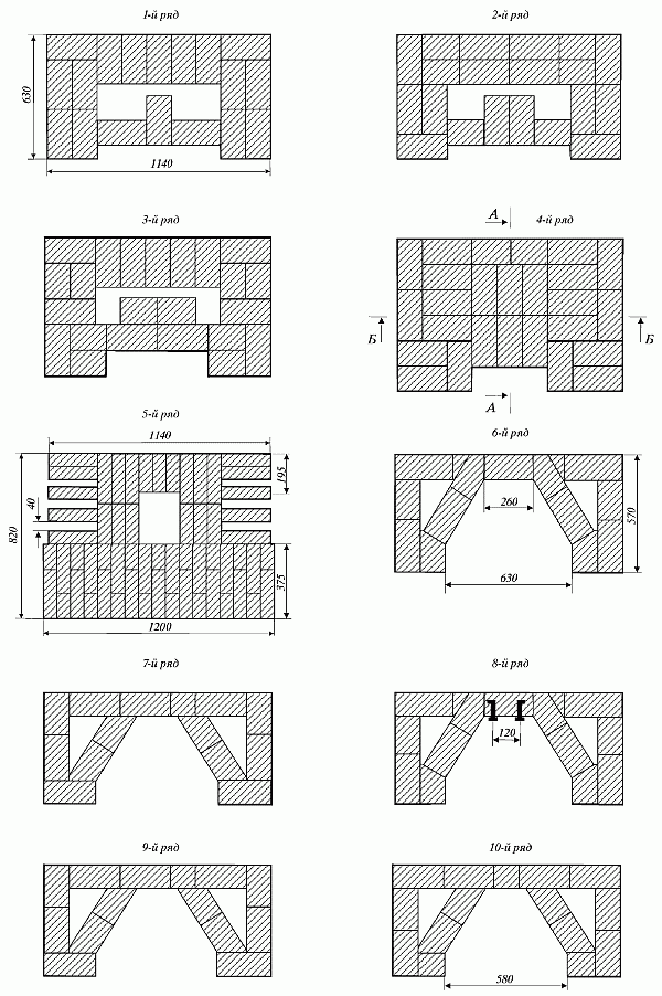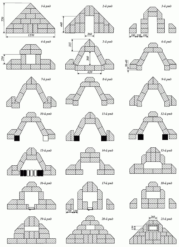 Размеры топочной камеры камина составляют 620 х 520 мм. Она перекрывается арочной перемычкой, кладку которой производят с выступом 50–60 мм. На 12–14м рядах в задней стенке выкладываются выступы, которые формируют дымовой зуб.