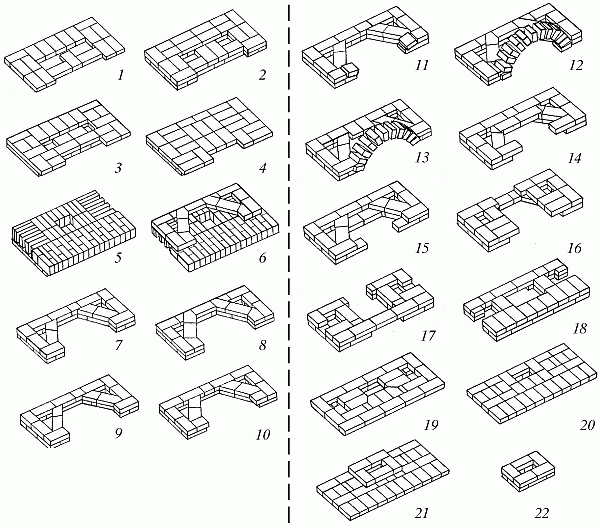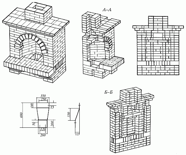 Рис. 91. Угловой камин: а – внешний вид; б – последовательность кладки