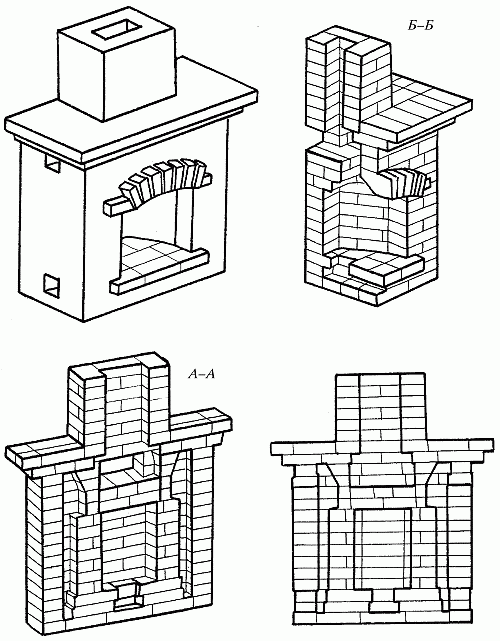Боковые стенки камина с арочной перемычкой имеют вертикальные каналы, по которым циркулирует воздух, поступающий через устроенные в 5м ряду отверстия и выходящий в помещение через душники, выложенные в 17–18-м рядах.