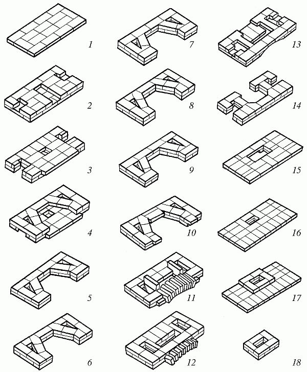 Боковые стенки топочной камеры выполняются развернутыми, а задняя – с выступами на 13–15м рядах, образующими «дымовой зуб», который устраивается способом напуска кирпича. Этот упрощенный вариант кладки предусматривает закрывание задней стенки топливника отражающим металлическим экраном. Для его закрепления используются штыри, которые закладываются в швы между 8м и 9-м, а также 14м и 15-м рядами.