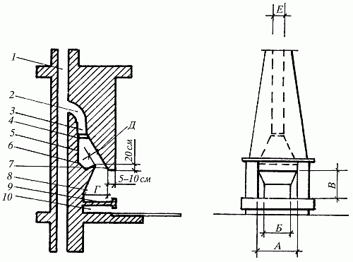 Рис. 94. Камин, пристроенный к дымовой трубе: 1 – дымовая труба; 2 – колено; 3 – дымоход; 4 – задвижка; 5 – дымовая камера; 6 – обратное днище; 7 – стенка; 8 – топка; 9 – днище (под); 10 – зольник; А – ширина топки; Б – задняя стенка; В – высота топки; Г – глубина топки;Д – дымовое отверстие (горловина); Е – дымовая труба