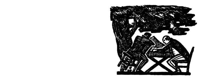 Около пяти часов пополудни. Под дуплистым буком поставлен легкий стол, за которым сидит полковник, погруженный в изучение планов геологической съемки. Сидя верхом на плетеном стуле, Левер курит папиросу. Дик развешивает китайские фонарики на ветвях бука.