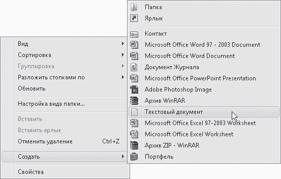 Кстати, в верхней части подменю Создать есть две особые команды: Папка и Ярлык.