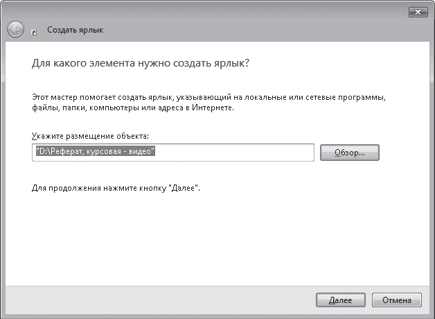 Итак, команда Ярлык создает эту самую ссылку на файл или папку. Если в меню выбрать эту команду, откроется окно (рис. 3.12), в котором нужно выполнить следующие действия.