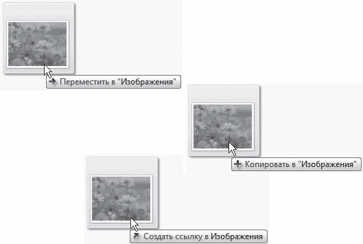 Второй способ переноса и копирования – перетаскивание мышью. Для этого должны быть открыты и папка, где хранится исходный объект, и папка, в которую нужно его перенести или скопировать. Щелкните на объекте кнопкой мыши и, не отпуская ее, перетащите его в новую папку. Как только он окажется в пределах нового «места жительства», отпускайте кнопку – объект переместится или будет скопирован. В процессе вы будете видеть крупный полупрозрачный эскиз – объект с подписью, которая поясняет, что, собственно, происходит (рис. 3.13).