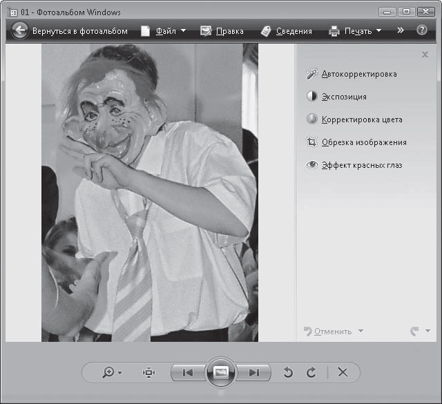 Разработчики снабдили Фотоальбом Windows набором важнейших инструментов, с помощью которых вы сможете устранить наиболее часто встречающиеся дефекты съемки. Чтобы ознакомиться с ними, нажмите кнопку Правка на панели инструментов в окне просмотра. В результате справа от изображения откроется панель, содержащая средства коррекции снимков (рис. 6.8).