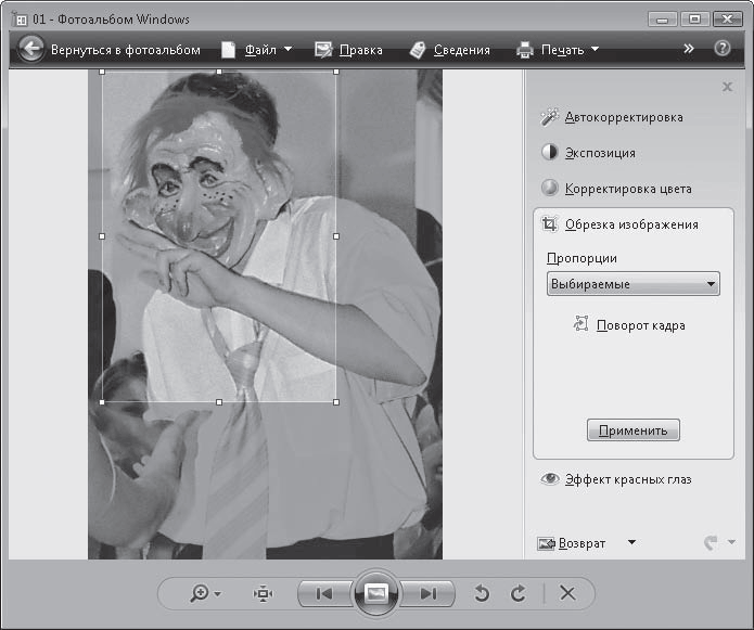 Любое редактирование фотографии можно отменить, если результат вам не понравился. Для этого щелкните кнопкой мыши на кнопке Отменить, которая находится в нижней части панели с инструментами редактирования. Вы можете отменить одно последнее действие простым нажатием кнопки, а можете и несколько, щелкнув кнопкой мыши на стрелке этой кнопки. Если отменили зря, можно восстановить результат отмененного действия с помощью кнопки Вернуть.