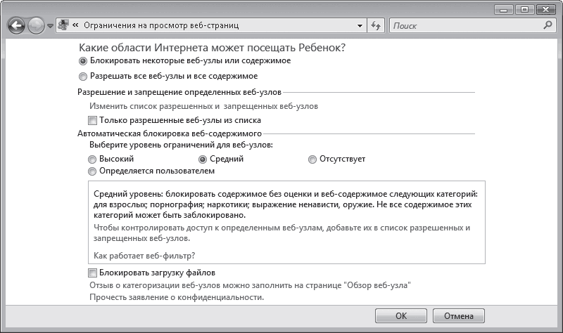 Чтобы вручную создать список разрешенных узлов и установить право только на их посещение, щелкните кнопкой мыши на ссылке Изменить список разрешенных и запрещенных веб-узлов, введите адрес интернет-ресурса и нажатием кнопки Разрешить или Запретить поместите адрес в соответствующий список. Если вы хотите, чтобы ребенок посещал только разрешенные вами сайты, установите флажок Только разрешенные веб-узлы из списка. При необходимости можно заблокировать скачивание файлов установкой флажка Блокировать загрузку файлов. Нажмите ОК, чтобы вернуться к окну выбора параметров.