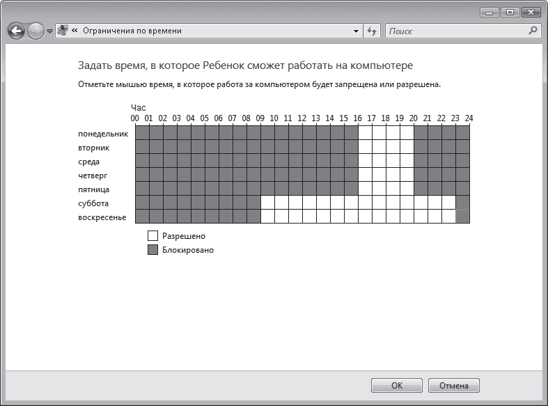 7. Щелкнув кнопкой мыши на ссылке Ограничения по времени (см. рис. 7.3), вы можете составить почасовое расписание доступа к компьютеру ребенка. Для этого мышью (при нажатой левой кнопке) выделите синим цветом клетки, которые соответствуют запретным для работы на компьютере интервалам времени (рис. 7.5). Повторное выделение снимает блокировку. Нажмите ОК.