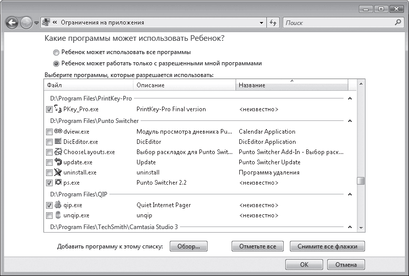 9. Выбрав ссылку Разрешать и блокировать конкретные программы (см. рис. 7.3), вы сможете задать ограничение на использование программ, установленных в системе. Например, если ваш ребенок – большой любитель посмотреть фильмы и поболтать в ICQ вместо того, чтобы делать уроки, можете запретить использование всех медиапроигрывателей и интернет-пейджеров, имеющихся на вашем компьютере. Установите переключатель в положение Ребенок может работать только с разрешенными мной программами и отметьте флажками те приложения, доступ к которым разрешен (рис. 7.6).