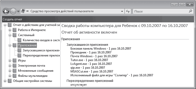 10. Чтобы контролировать действия ребенка на компьютере в ваше отсутствие, просматривайте отчет о его работе в системе. Для этого щелкните кнопкой мыши на ссылке Просмотреть отчеты об активности и в открывшемся окне ознакомьтесь с содержанием интересующих вас разделов (рис. 7.7). Предложение ознакомиться с отчетом о родительском контроле может появляться и в виде всплывающей таблички в области уведомлений. В этом случае достаточно щелкнуть кнопкой мыши на ней, чтобы открылось окно отчета.