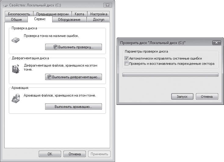 В состав Windows входит специальная утилита проверки жесткого диска, с помощью которой можно избавиться от потерянных кластеров и пометить поврежденные. Чтобы запустить ее, выполните команду Пуск -> Компьютер, щелкните правой кнопкой мыши на том диске, который хотите проверить, и в открывшемся меню выполните команду Свойства. В открывшемся окне перейдите на вкладку Сервис (рис. 8.14, слева) и нажмите кнопку Выполнить проверку. При этом откроется окно параметров проверки (рис. 8.14, справа). На нем есть два флажка.