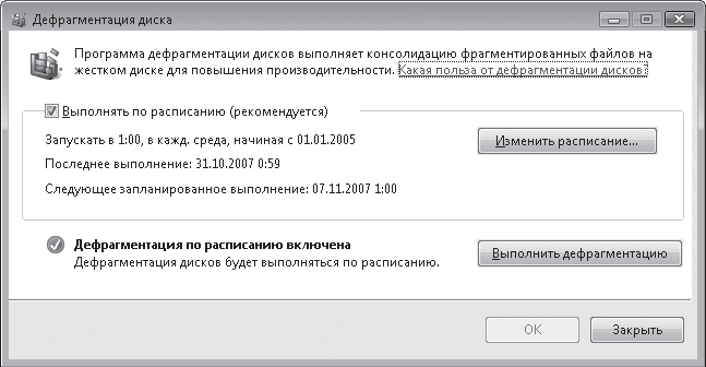 По умолчанию дефрагментация диска автоматически выполняется раз в неделю, но вы можете изменить расписание или немедленно запустить процесс. Для этого нажмите кнопку Выполнить дефрагментацию в окне, изображенном на рис. 8.14.