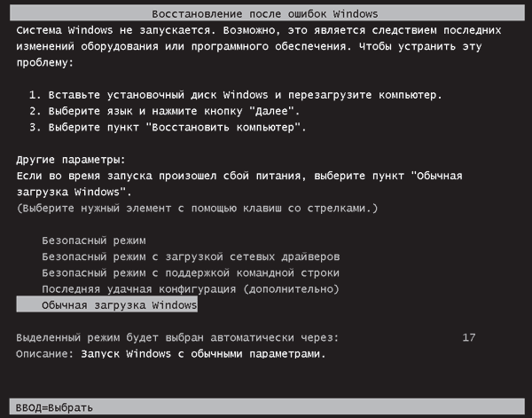 Иногда после установки нового драйвера или программы может произойти сбой в системе, и Windows начинает «глючить» (работать нестабильно) или вовсе не запускается. Вы перегружаете компьютер и видите на экране странное меню, в котором предлагается выбрать один из особых вариантов загрузки (рис. 8.16).