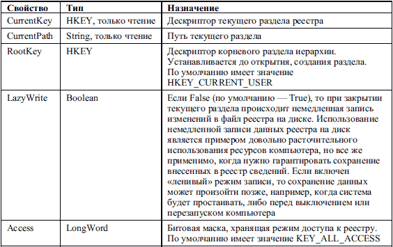 Приводить список всех методов класса TRegistry в книге нерационально, да и незачем. Благо, названия методов говорят сами за себя, к тому же Delphi поставляется с неплохой справочной системой. Здесь же мы остановимся на рассмотрении некоторых особенностей работы с методами класса TRegistry.