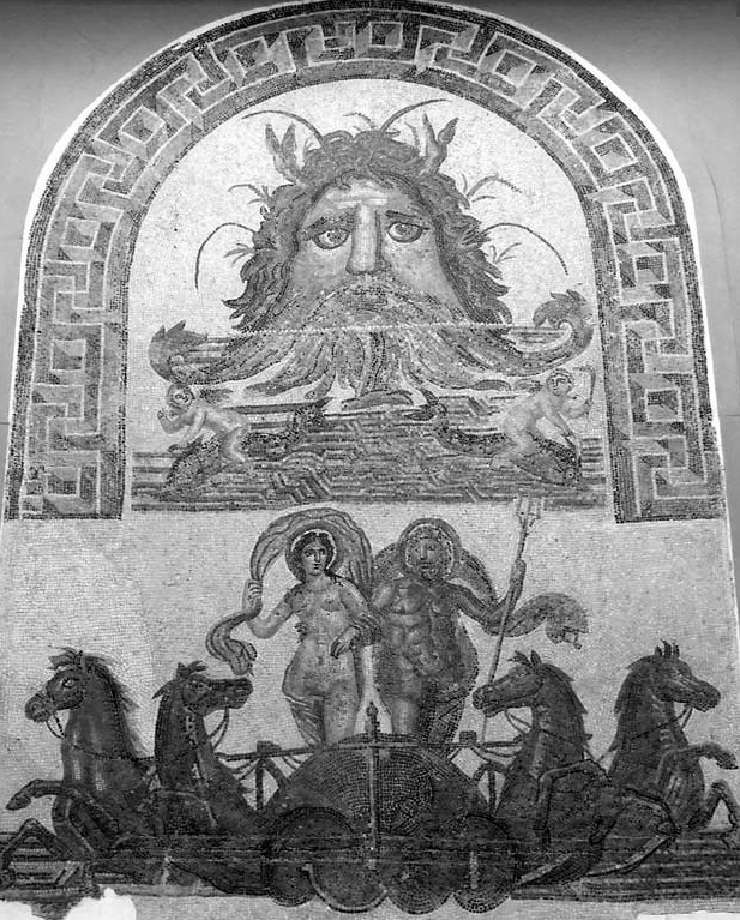 Североафриканские мозаики. Интересны нимбы вокруг голов богов. В античности нимбы использовали по мере надобности, для смыслового выделения и большей контрастности изображения. В христианском карго-культе это стало уродливым каноном, применяющимся ни к селу, ни к городу. Скорее всего, христиане стали рисовать вокруг божественных персон круги, не поняв функционального предназначения менисков. Мениск это металлический круг, которым покрывали головы статуй на открытом воздухе, чтобы их не обгаживали птицы. Интересно, что в эпоху возрождения такое восприятие нимба сохранилось и в трёхмерых изображениях нимбы рисовали как металлические плоские шляпы: