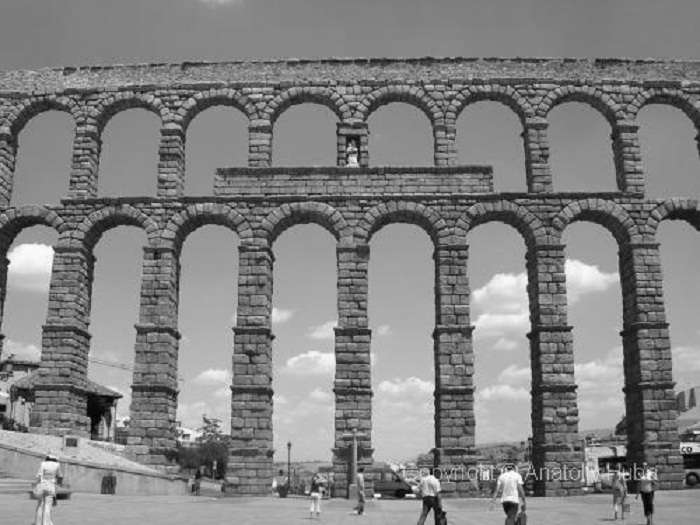 Акведук в Сеговии (Испания). То, что обычно называют акведуками, это их видимая часть – 90-99%% акведуков проходит под землёй, иногда на большой глубине. Общая длинна акведука может превышать 100 км.