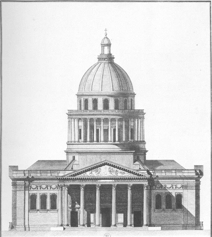P.S. Да, чуть не забыл. На первом рисунке план «улучшения» храма святой Женевьевы в эпоху французской революции. Сам храм (теперь французской Пантеон) выглядит так:
