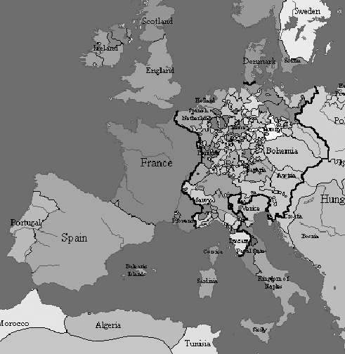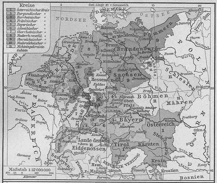 Точно так же, как Францию 16 в., можно представить централизованным государством Священную Империю. Причём влёгкую. Вот карта имперских округов. Одиннадцать провинций единого государства. Чего тут такого?