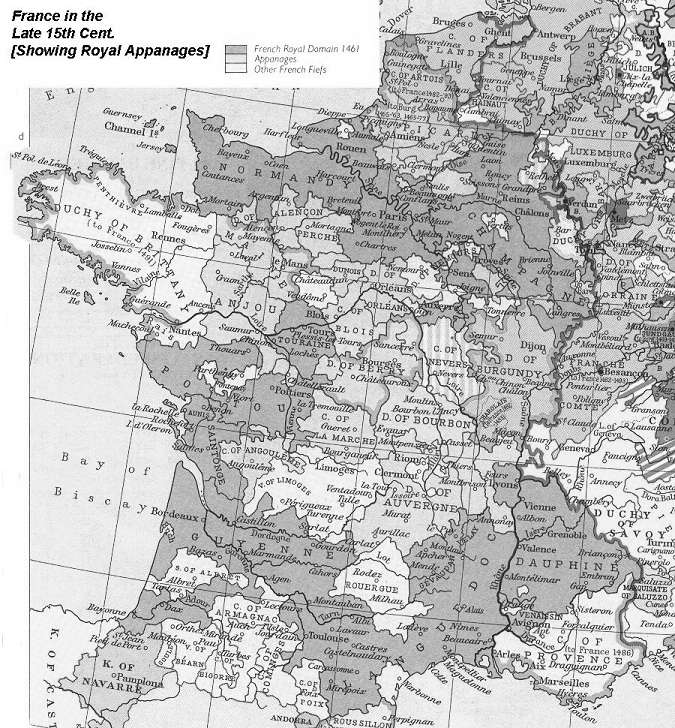То же самое, что выше, но с деталями. В 18 веке Франция была централизованным государством и экстраполировала статус кво в прошлое. Но два века назад там была примерно такая же чересполосица, что вовсе не свидетельствовало о хаосе. Просто муравейник или пчелиный улей устроены иначе, чем енот. На карте французское лоскутное одеяло всё-таки закрашено различными тонами одного цвета. Мол, одеяло своё, родное. А если разобраться во всех этих апанажах и доменах, то видно, что пред нами канцелярский бред 17 века.