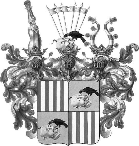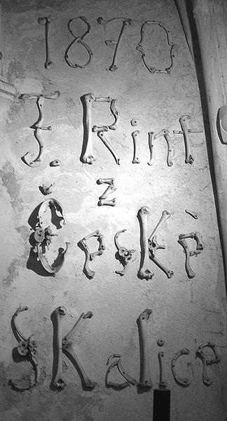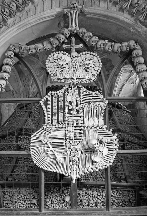 На самом деле эта церковь новация. Её построили в преддверье начинающегося декаданса по приказу медиатизированного старичка из СРИГНа князя Шварценберга. Вот его малый герб, выложенный костями. Как говорится, «у каждого барона своя причуда».