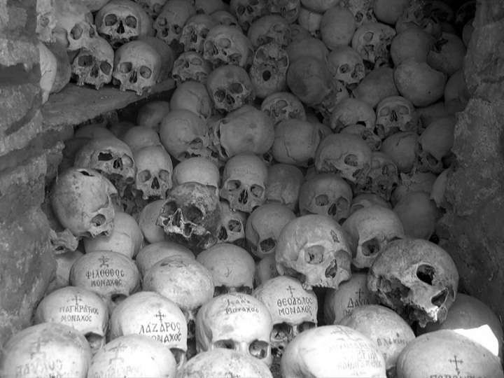 Подобные артефакты не есть особенность католицизма. Вот аналогичное захоронение на православном Афоне. Сначала умерших монахов предают земле. Через несколько лет разрывают могилы и смотрят – правильно ли разложился труп. Если правильно, с черепа соскребают сгнившие остатки и помещают в «костяницу».