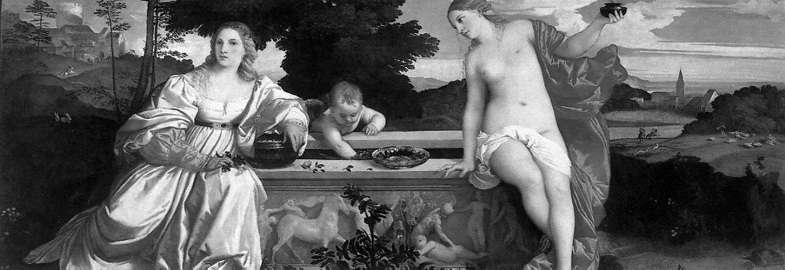 Тициан. «Любовь земная и Любовь небесная». Голая это как раз небесная :) Вам никогда не приходило в голову, что В РЕАЛЬНОМ ВРЕМЕНИ мы нигде не видим христианства вне языческого контекста? Вот чтобы амуров и нимф не было, а Христос и Богородица были. Считается, что такое волшебное время когда-то давным-давно было, люди про Юпитера или Артемиду счастливо забыли. Но посмотреть на это негде. Более того, у художников 16 века гораздо меньше христианских сюжетов, чем в веке 17.