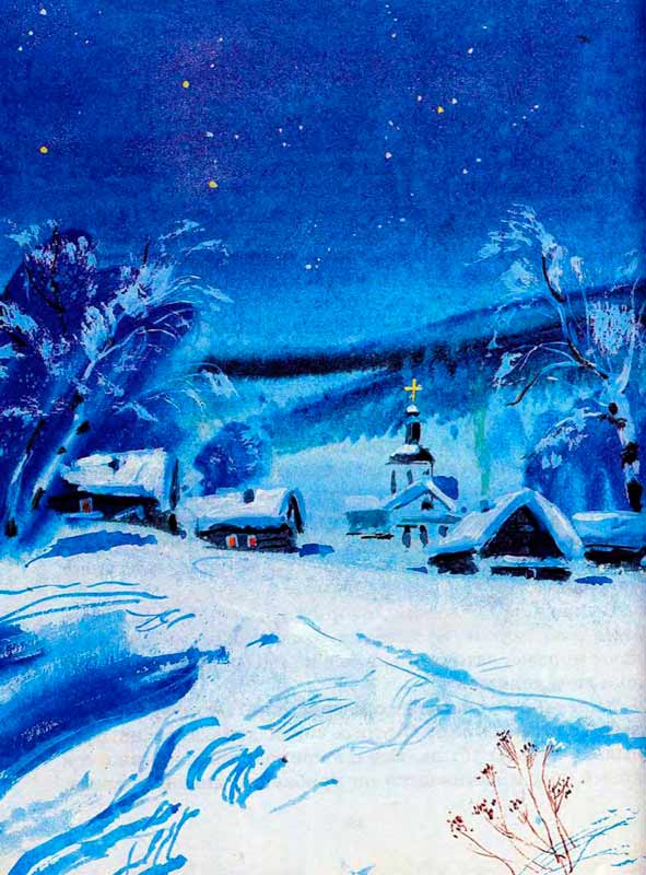 Зимняя полночь. Крепчает мороз, густым серебряным инеем опушил он ветви деревьев, будто одел их в белые варежки.