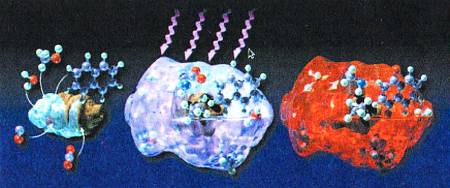 Слева направо: частица космической пыли, покрытая тонкой оболочкой льда, содержащего молекулы воды, СО, С02, метанола и аммиака; частица пыли в ледяной оболочке подвергается действию ультрафиолета; в результате фотохимических реакций в ледяной оболочке формируются радикалы и сложные органические молекулы.